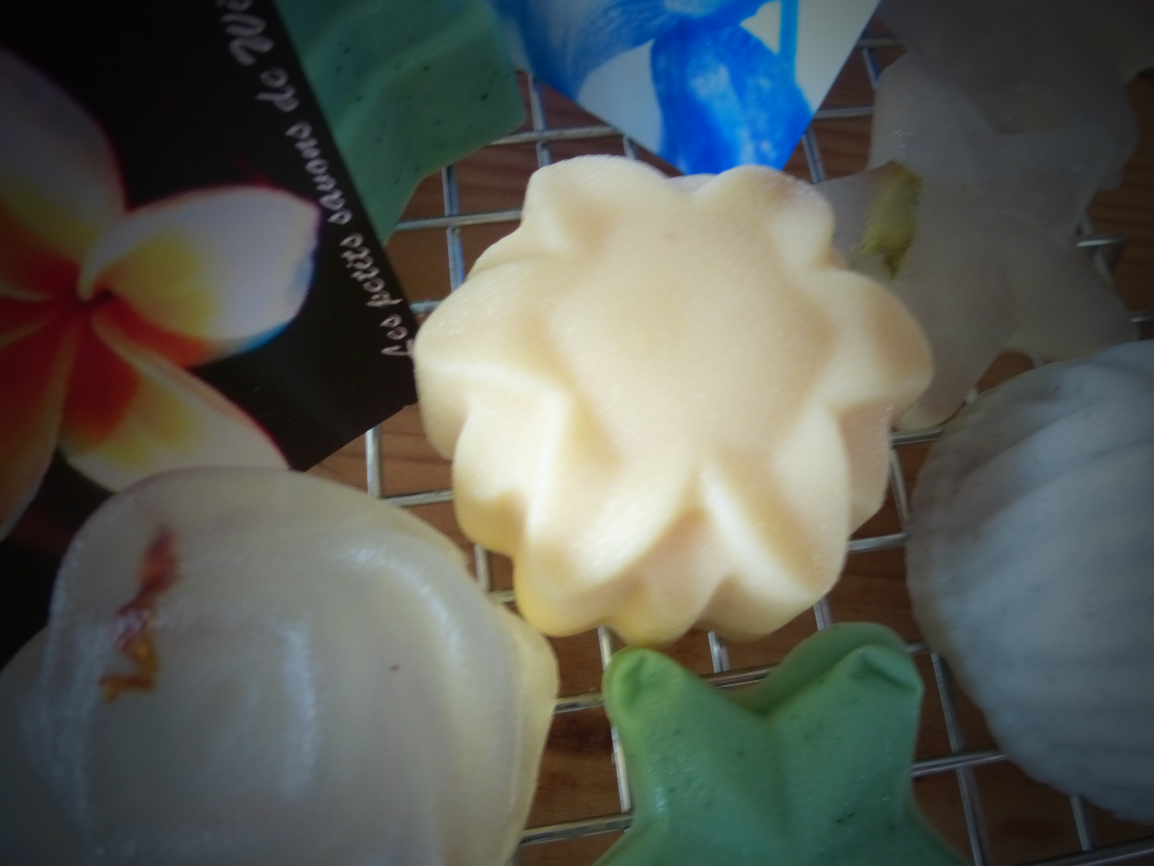 Nous avons utilisé 3 bases de savon : Blanche (dans laquelle j’ai ajouté 10% de beurre de Tucuma, pour encore plus de douceur), Blanche au lait de chèvre (+10% de beurre de Mangue) et la base transparente. Attention, 10% de beurre, c’est peut-être légèrement trop (ils suintaient un peu ce matin !!).