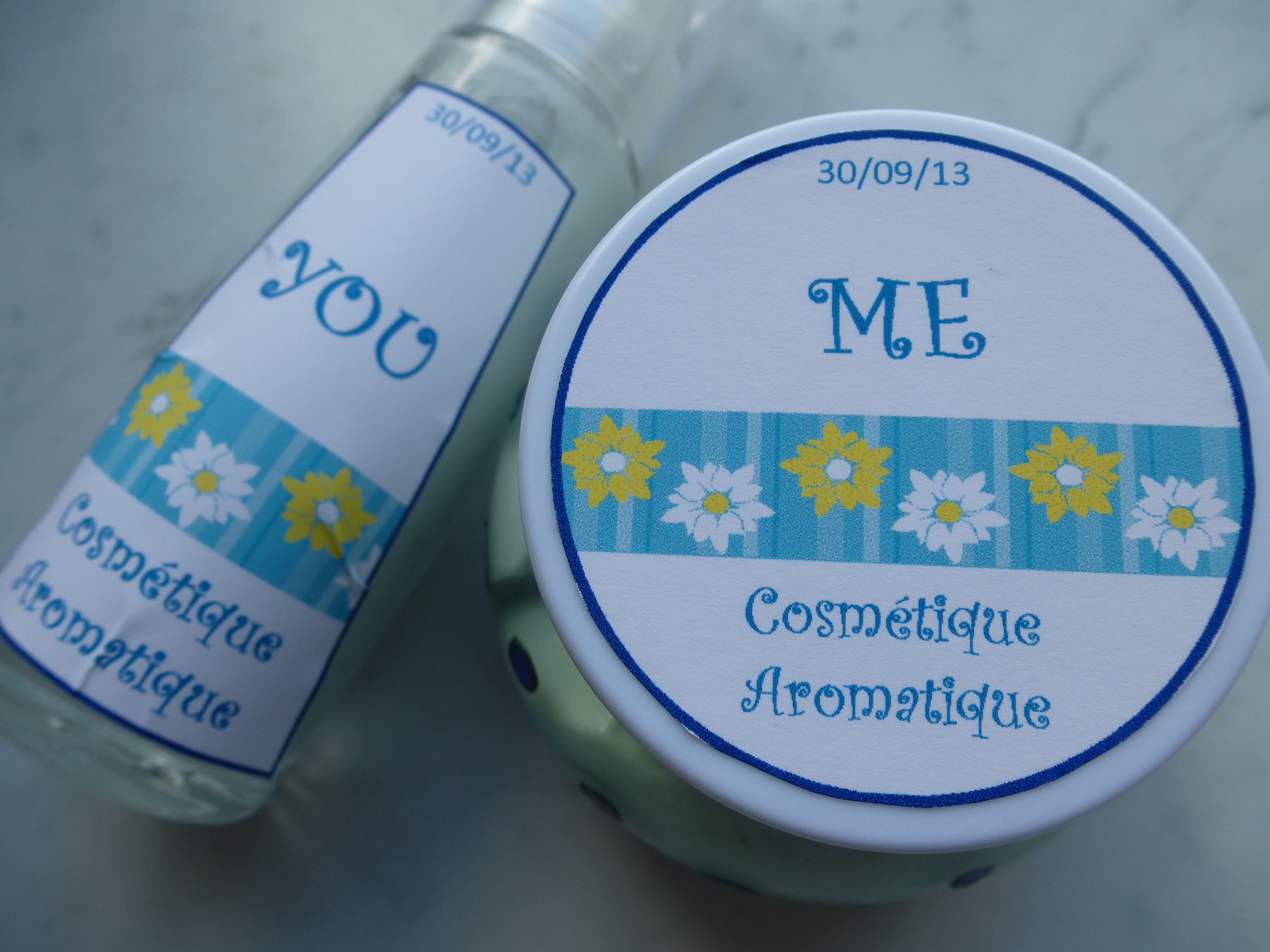 Comme mon amoureux et moi avions besoin d’une petite crème de jour : la sienne, pleine de chimique, était presque terminée et la mienne (home made) qui commençait à sentir un peu l’huile rance (!!), je me suis attaquée à la création de deux petites crèmes.