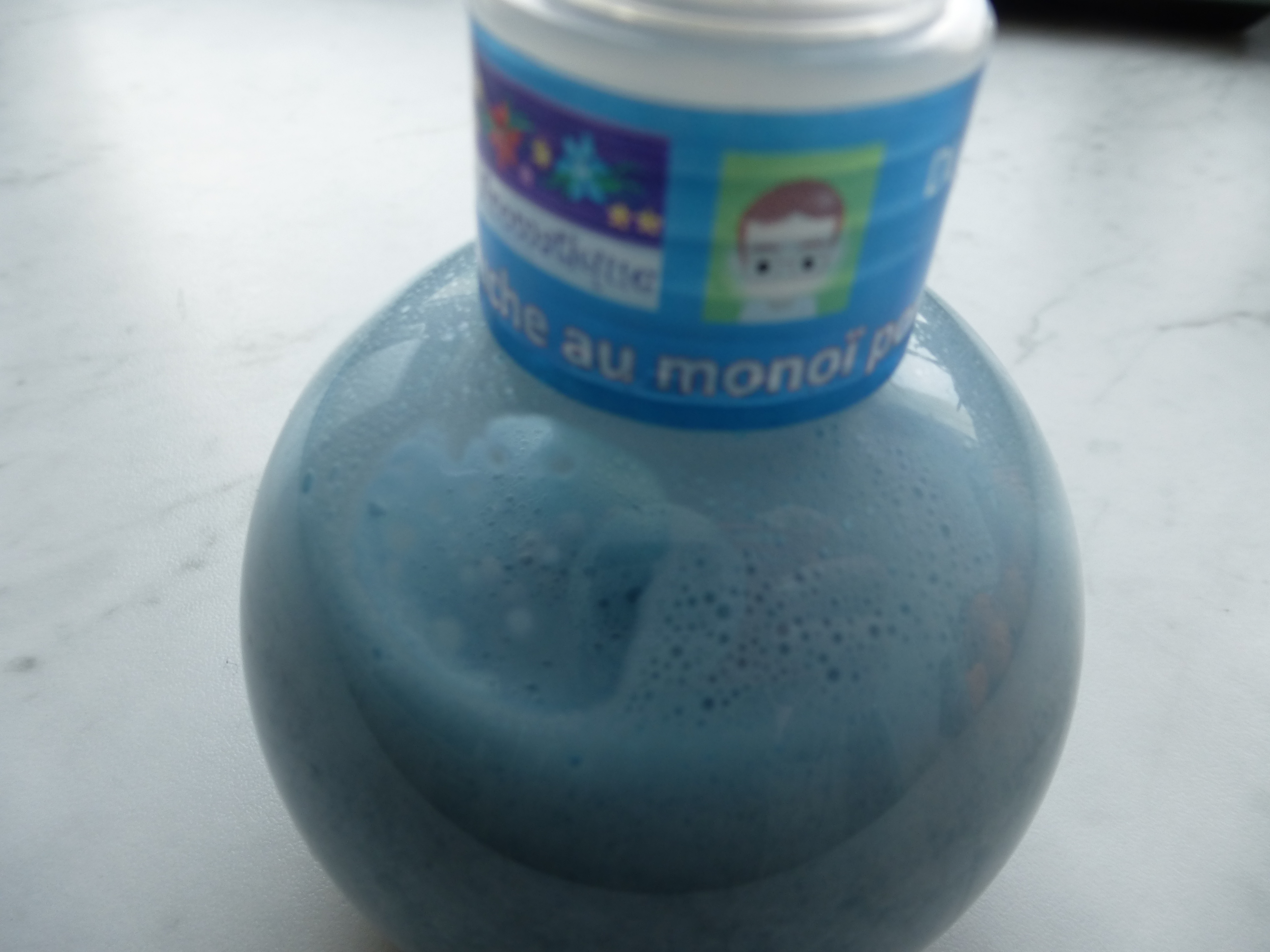Résultat : un gel douche tout doux qui sent bon le Monoï, avec une jolie couleur bleu (pour les garçons 😉 )