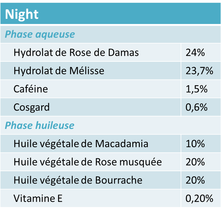 NIGHT : biphasé à appliquer tous les soirs avant le soin de nuit