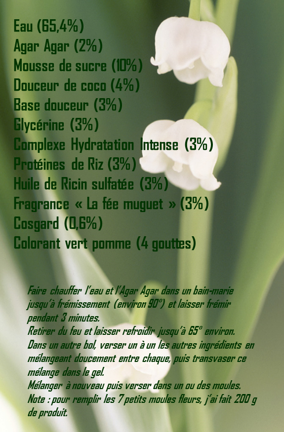 Aujourd’hui, fête du muguet oblige, j’ai cherché ce que je pouvais faire de « vert » et qui sentirait le muguet et là, de mon super cerveau complètement éteint (oui, c’est la fête du travail, ce qui ne veut pas du tout dire : youhou, c’est la fête, je vais au travail, non, non  !!), une petite recette de gelée de douche a quand même émergé !
