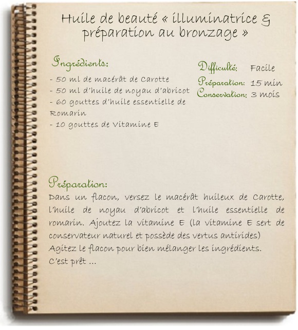 J’ai choisi de tester le coffret « Soleil et Vacances » (CLIC ICI pour la description du coffret) et je commence par une recette toute simple « d’Huile de Beauté illuminatrice et préparation au bronzage ».