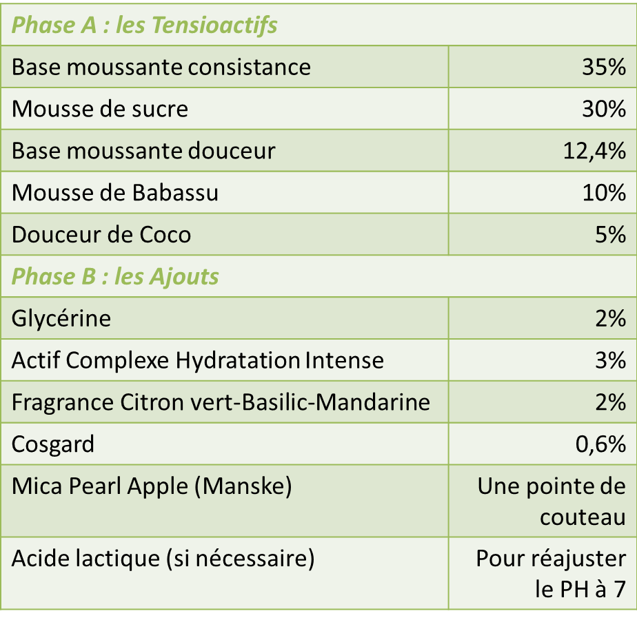 J’ai choisi un PH neutre (7) pour obtenir un gel lavant très doux. J’ai dû ajouter quelques gouttes d’Acide lactique pour faire redescendre un peu le PH (le PH de la Base consistance et celui de la Mousse de sucre étant relativement élevé (11.5-12.5).