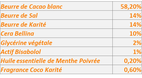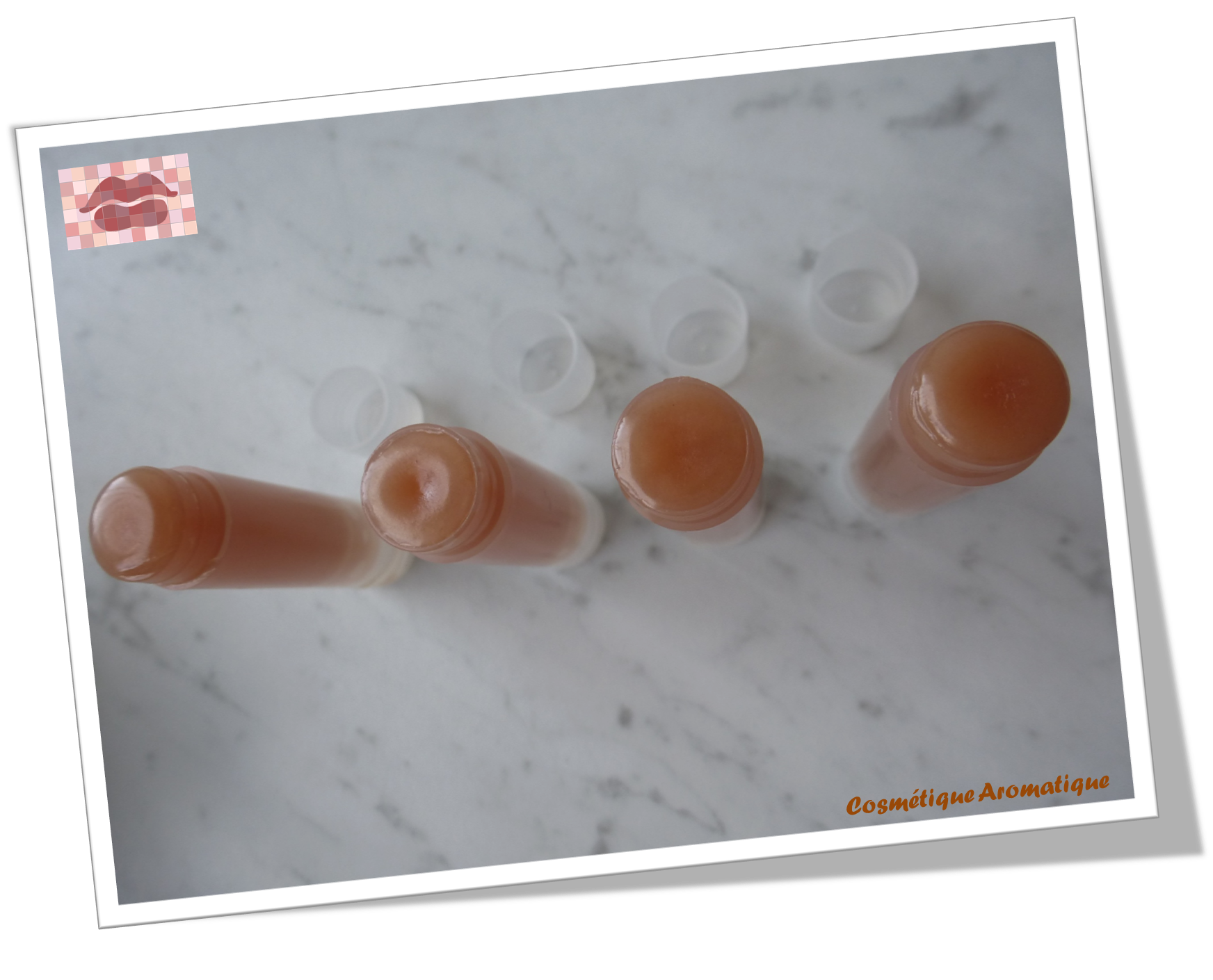 Mode opératoire : faire fondre au bain-marie les beurres et la cire, puis ajouter les autres ingrédients un par un, hors du bain-marie. Verser dans le tube avant que la préparation durcisse.