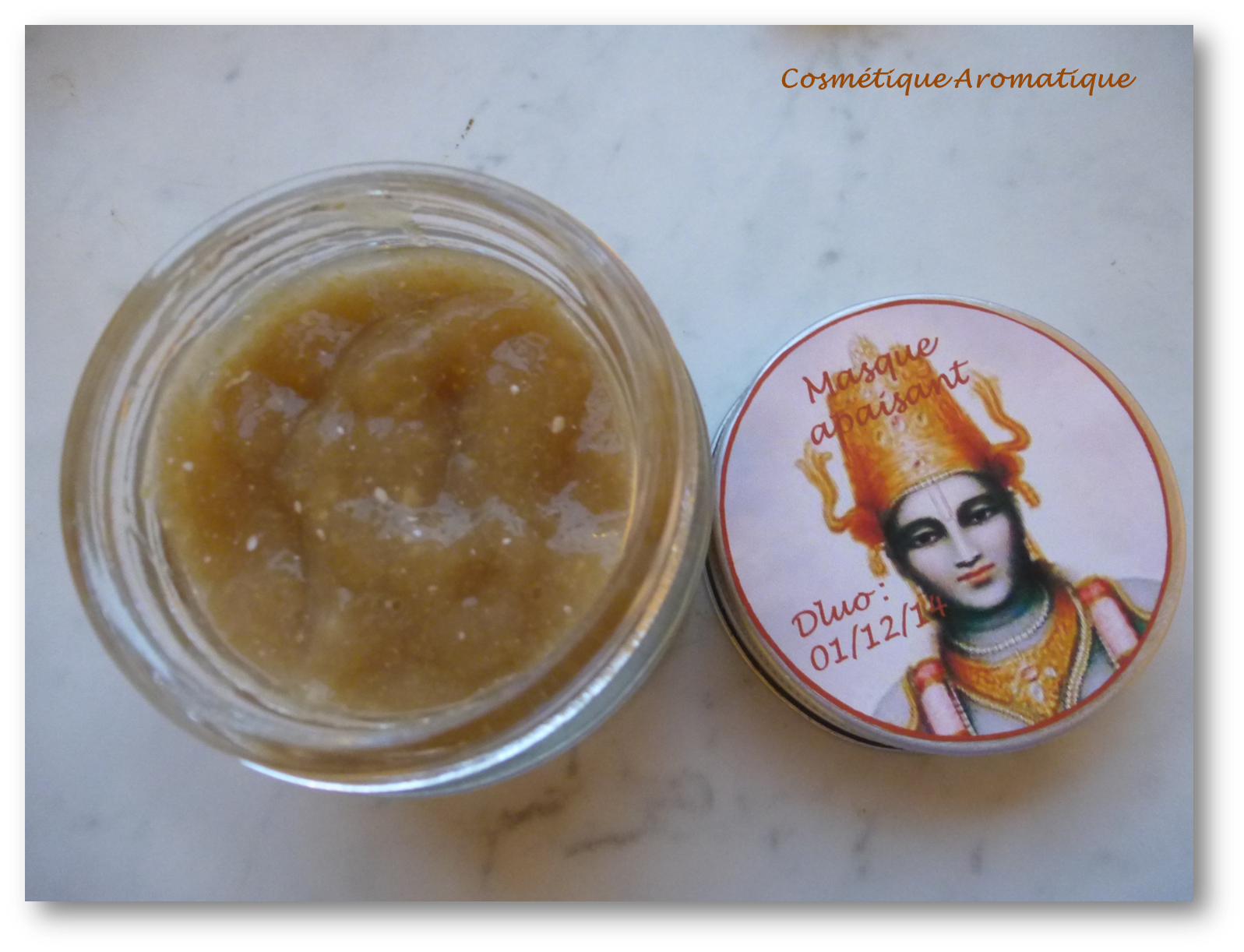 Ma swappée ayant la peau sèche et réactive, j’ai choisi des actifs apaisants et hydratants pour ce masque : le Fucocert (qui combine les 2 propriétés), la Gelée Royale (qui hydrate et apaise les irritations), l’Allantoïne (pour ses propriétés cicatrisantes et réparatrices) et le Thé vert (qui calme les inflammations). Vous remarquerez que j’ai utilisé également du Naticide pour le conservateur (100% naturel).