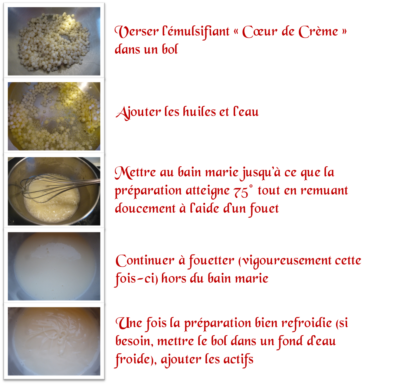 C’était une belle occasion de tester le nouvel émulsifiant d’Aroma-Zone : le Cœur de Crème, mais aussi le « One pot » que je n’avais jamais essayé (on mélange phase aqueuse et phase huileuse, on met au bain marie, on toutouille et c’est prêt !).