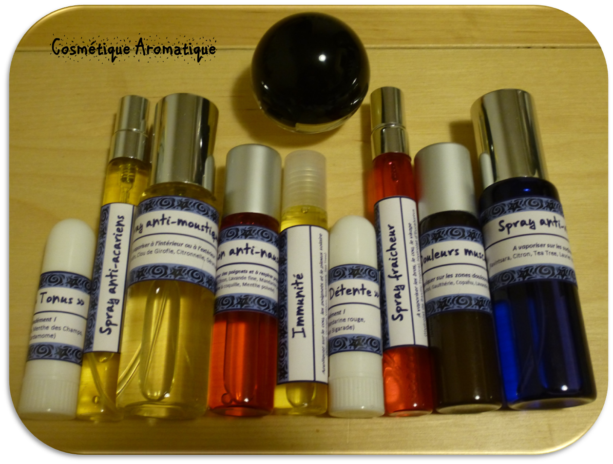 Voici quelques produits d’Aromathérapie réalisés à l’occasion du départ de deux jeunes voyageurs dans des contrées lointaines 😉