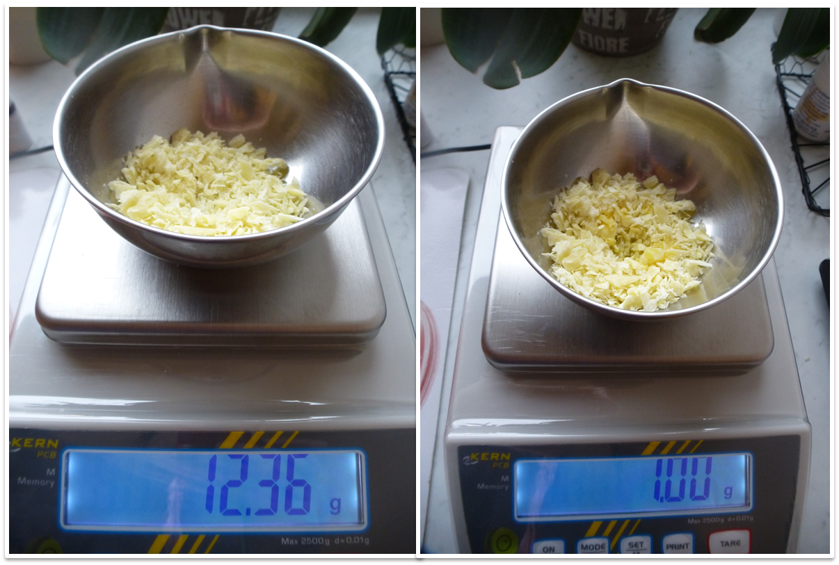 Commencer par ajouter dans un bol le beurre, les huiles, la cire et la vitamine E (et là, je vous présente avec joie mon cadeau de Noël arrivé un peu en avance : ma super balance de précision :-D).