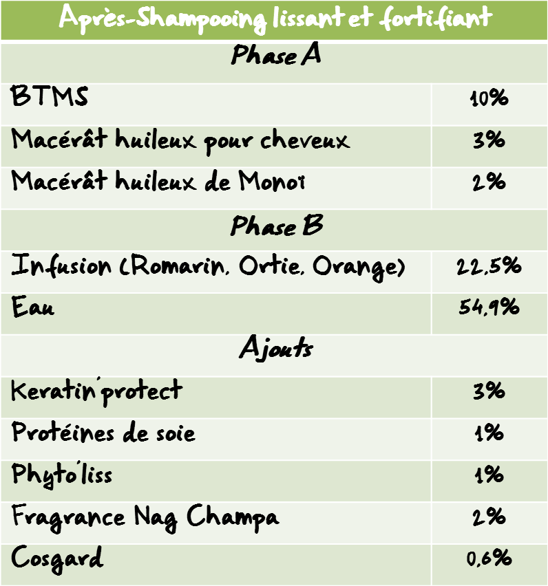 Ensuite, du Monoï (lissant et fortifiant), le Macérât huileux spécial cheveux d’Absolubio (favorise la circulation sanguine du cuir chevelu, renforce les cheveux) et les actifs Aroma-Zone : Protéines de Soie, Phyto’liss et Keratin’protect.