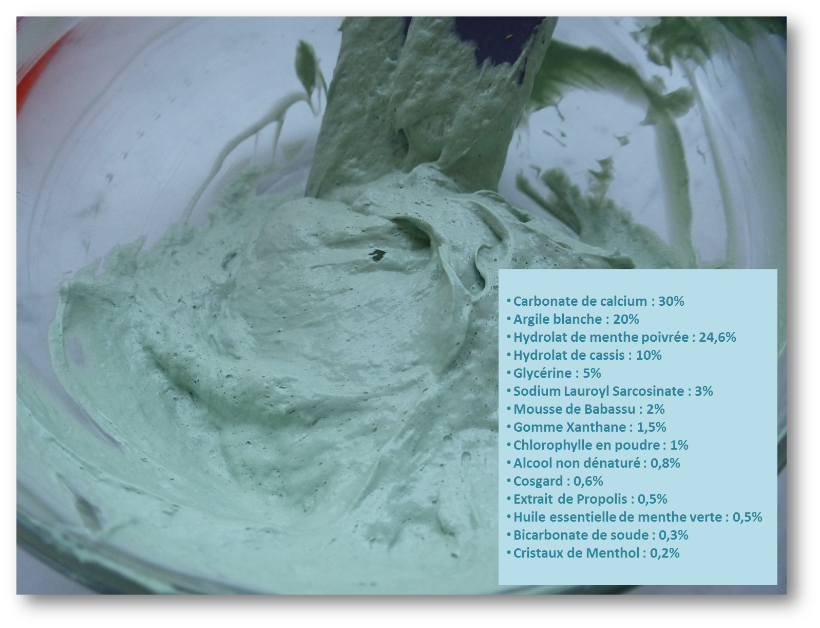Pour le mode opératoire, j’ai commencé par mélanger les poudres, puis j’ai ajouté le reste des ingrédients, en terminant par la Xanthane (vous pouvez diluer les cristaux de menthol dans la glycérine au préalable).
