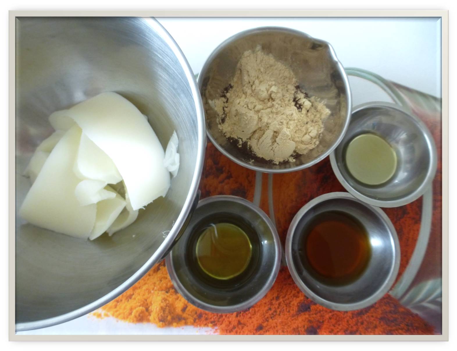 Comme à chaque fois, préparez bien tous vos ingrédients avant de commencer à chauffer le Melt & Pour (quand il sera fondu, il faudra aller vite pour les ajouter avant que le savon durcisse !).