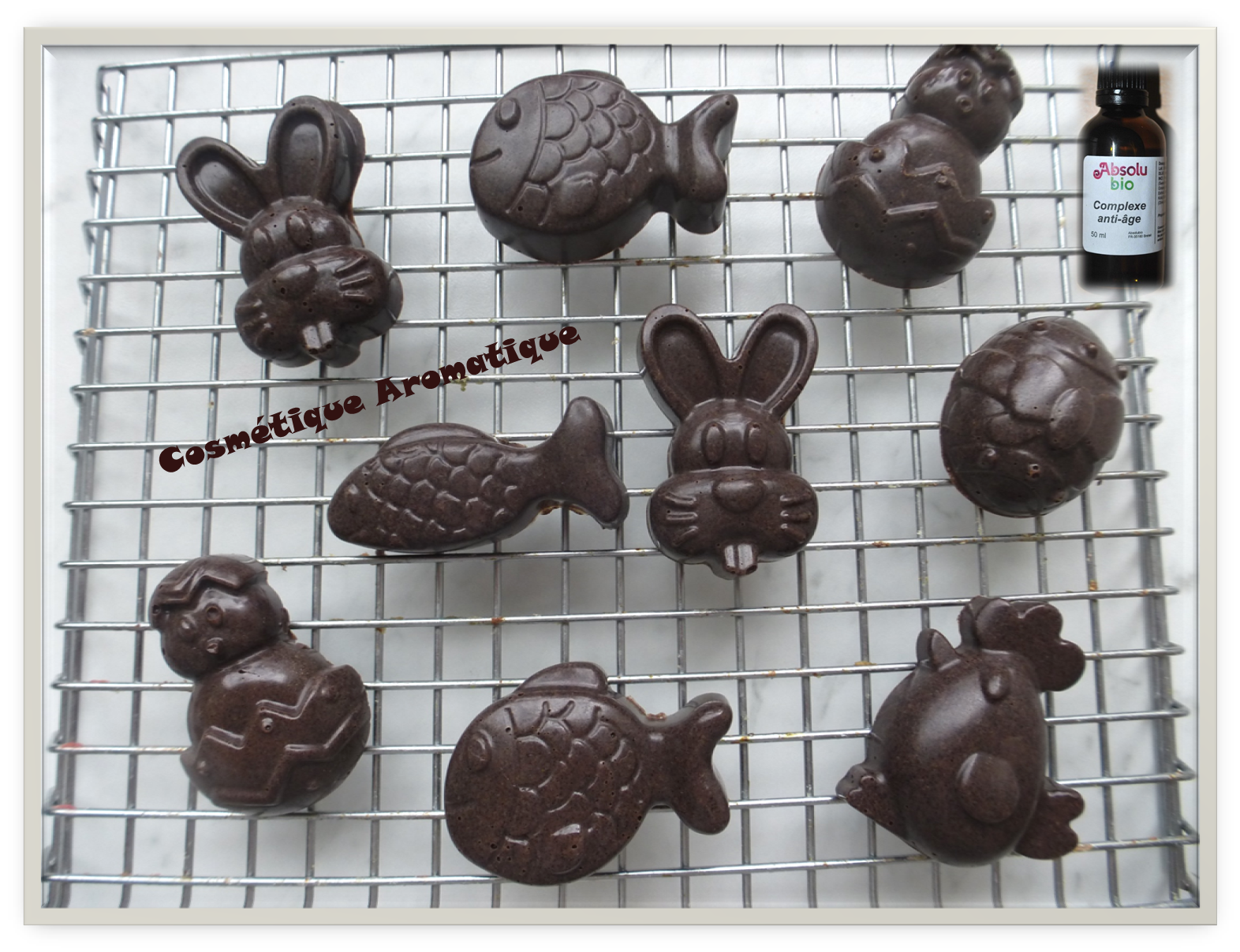 J’ai décidé de l’utiliser dans un premier temps dans mes chocolats savons visage ! Si vous avez lu mes précédentes recettes (j’en suis sûre !), vous aurez remarqué que j’aime mes savons Melt & Pour pour le visage. Comme mon précédent savon arrivait à sa fin, l’occasion était trop belle de tester le Complexe anti-âge d’Absolubio 🙂