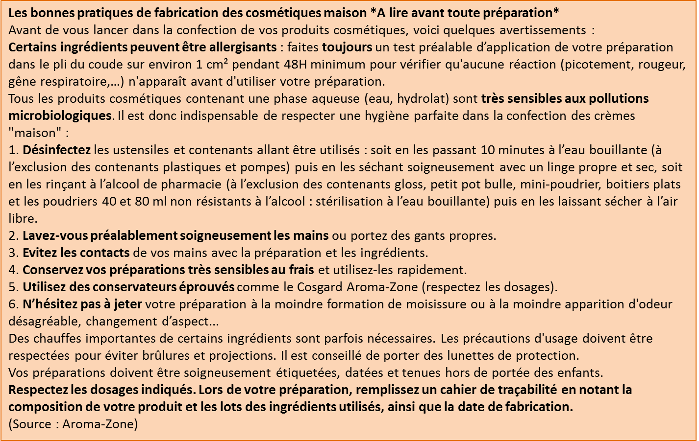Et comme c’est la rentrée, je vous rappelle ci-dessous les « Bonnes Pratiques de Fabrication » très importantes et à respecter lorsque vous vous lancez dans la cosmétique maison.