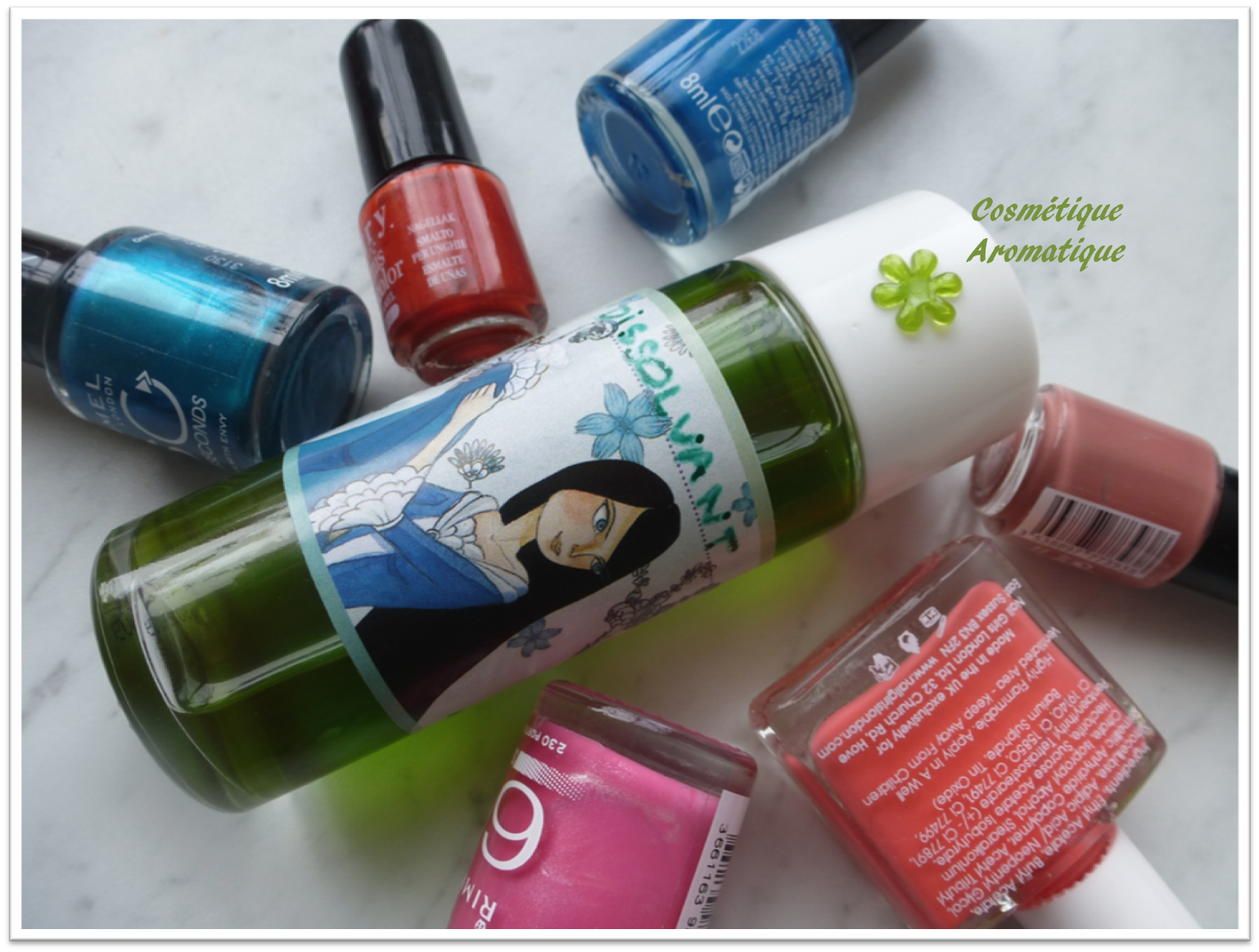 Ce dissolvant est très efficace, mais je ne l’ai pas encore testé sur mes vernis bleus ou verts… à suivre donc 🙂
