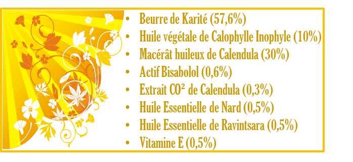 - Huile végétale de Baobab (5%) : embellisseur capillaire, nourrit et protège le cheveu sec, compense le manque de corps gras au niveau des pointes des cheveux