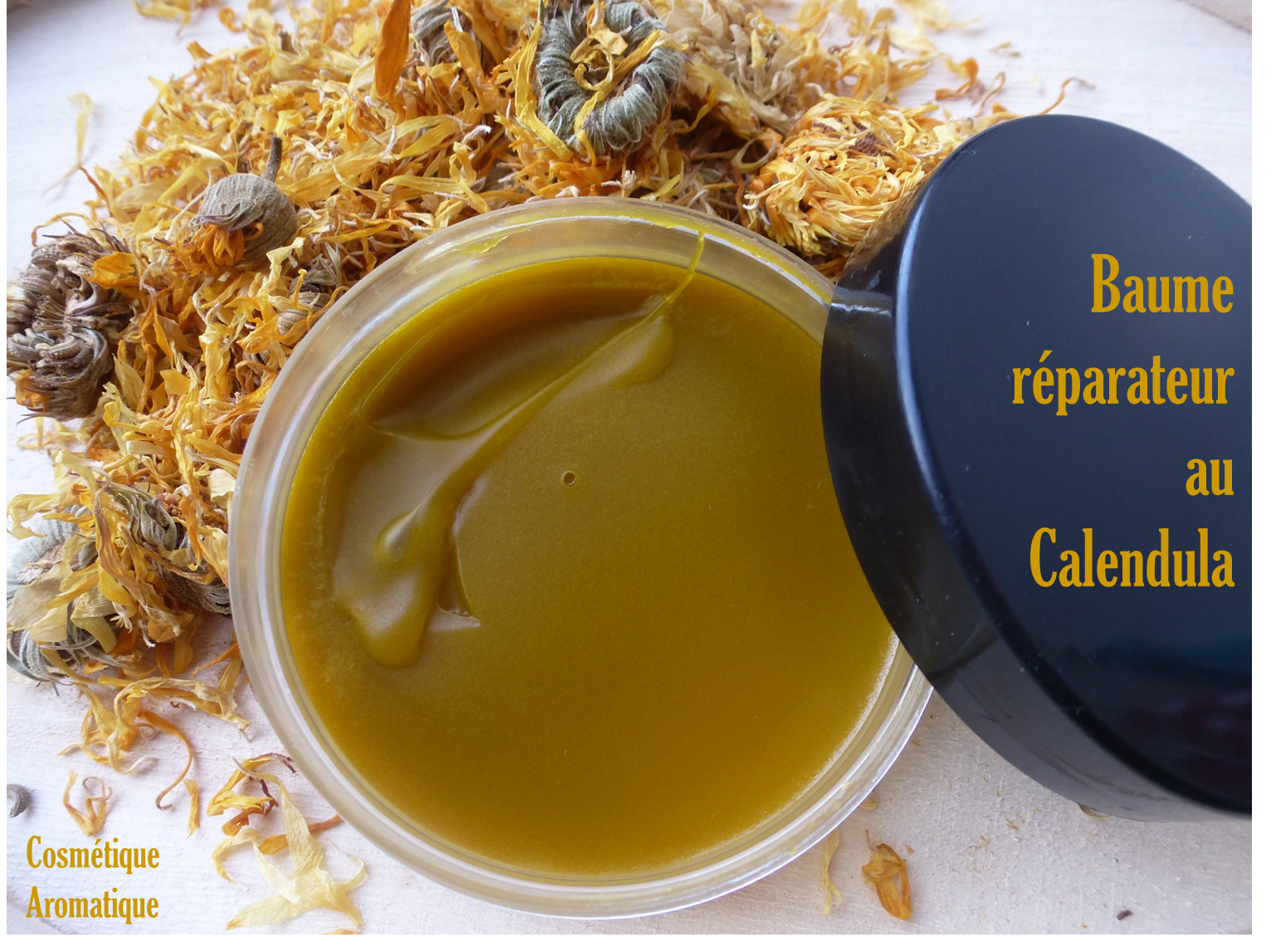 - Bien remuer et attendre que ça refroidisse un peu avant d’ajouter le reste des ingrédients (diluer l’Extrait CO² de Calendula dans les huiles essentielles pour faciliter son incorporation… ça colle !).