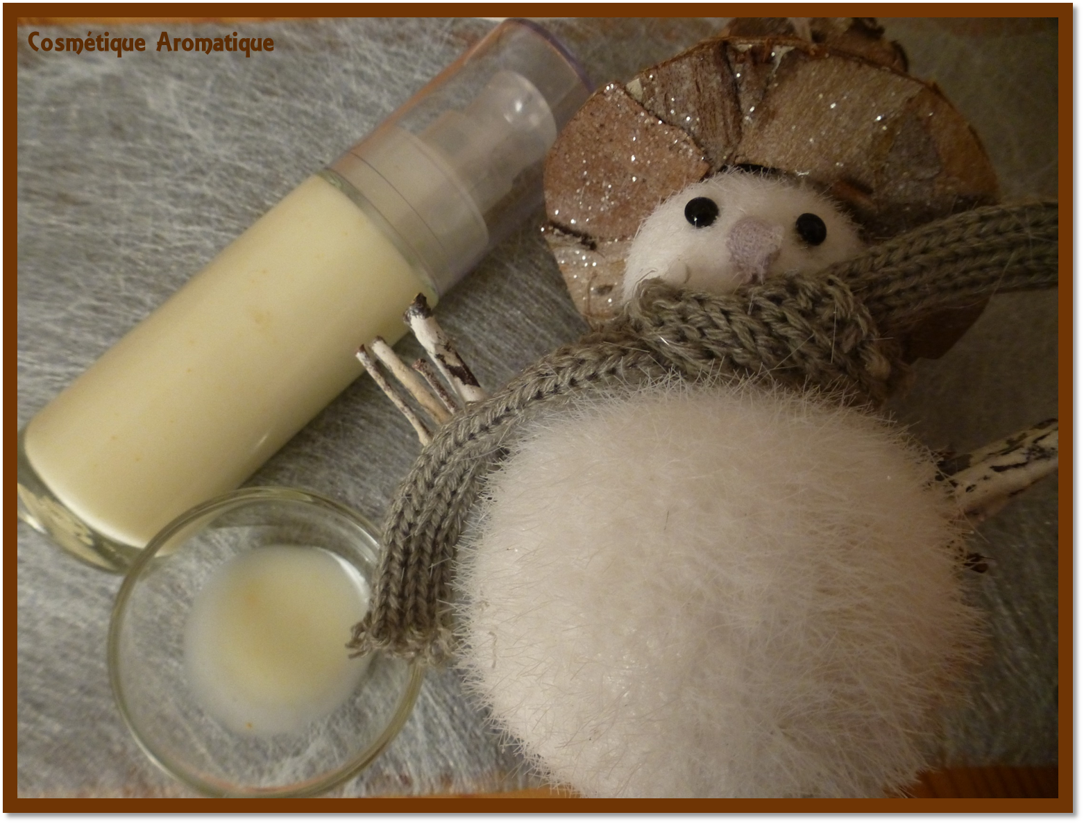 L’émulsion est réalisée avec 6% d’Emulsan (je pense qu’il s’agit de mon émulsifiant préféré 😉 ), 20% d’huiles végétales et 10% de Coco Silicone (pour donner un toucher soyeux).