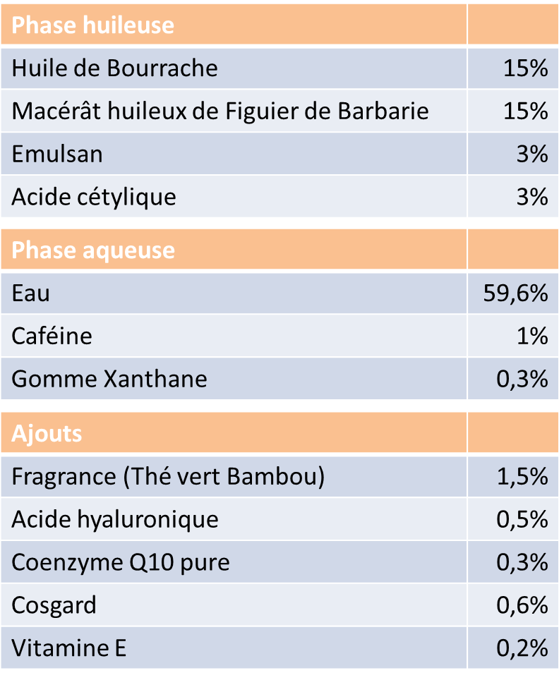 Mode opératoire : ajouter tous les ingrédients un par un en remuant entre chaque (remuer longtemps pour dissoudre la caféine). Les actifs étant solubles dans le gel, ajouter l’huile de rose musquée à la fin.